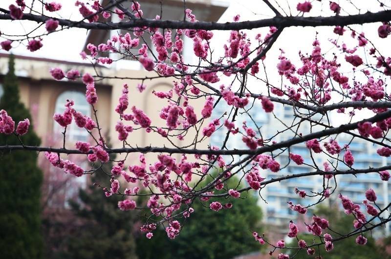镜头下,一朵朵红梅次第绽放,裹着淡淡的红晕,似娇羞少女颔首低语,微风轻拂,枝头嫣红轻轻摇曳,缕缕清香悄然漫开、沁人心脾,悄悄驱散了初春的余寒。作为初春最早绽放的花卉之一,红梅以坚韧的姿态,在寒意中悄然绽放,既为绿化带增添了色彩,更藏着威宁初春最鲜活的生机与气息。