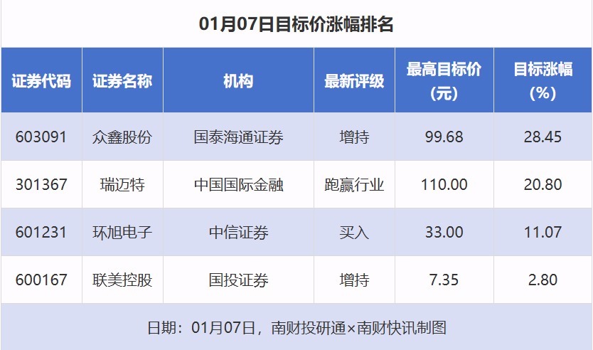 南财投研通数据显示,1月7日,券商给予上市公司目标价共4次,按最新收盘价计算,目标价涨幅排名居前的公司有众鑫股份、瑞迈特、环旭电子,目标价涨幅分别为28.45%、20.80%、11.07%,分别属于包装印刷、医疗器械、消费电子行业。