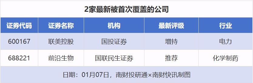 首次覆盖方面,1月7日券商共给出了2次首次覆盖,其中联美控股获得国投证券给予“增持”评级,前沿生物获得国联民生证券给予“推荐”评级。